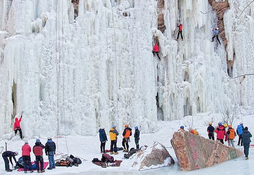 我很怕冷,攀冰中对我来说严寒是最大的考验。有一次,出门就特别冷,呵气成冰,我都能看见自己睫毛上的霜花。怎么办?爬吧,活动活动,产生热量也许会好过一点。于是全天我和赵凯你上我下,一直没停过。等到训练结束,我直冲淋浴房,哗的一声热水兜头浇下来,然后我一声惨叫,六七个手指的指尖瞬间青紫一片!当时我想完了完了,我攀不了岩了。好在两周之后,恢复如初。但这次遭遇给了我极其深刻的记忆。